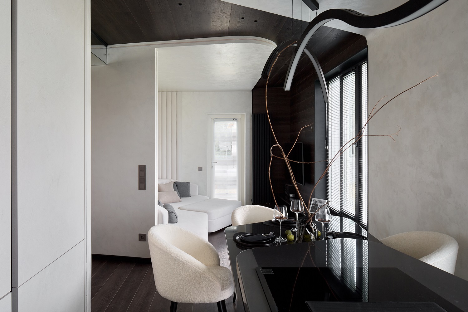 Дизайн-студия BALKA.Studio воссоздали на кухне героев выпуска атмосферу бизнес-класса самолета — получился эргономичный интерьер с обтекаемыми формами, высоким уровнем сервиса в зоне готовки и пространством для мягкой посадки в зоне отдыха.