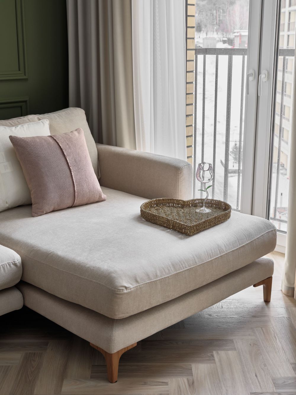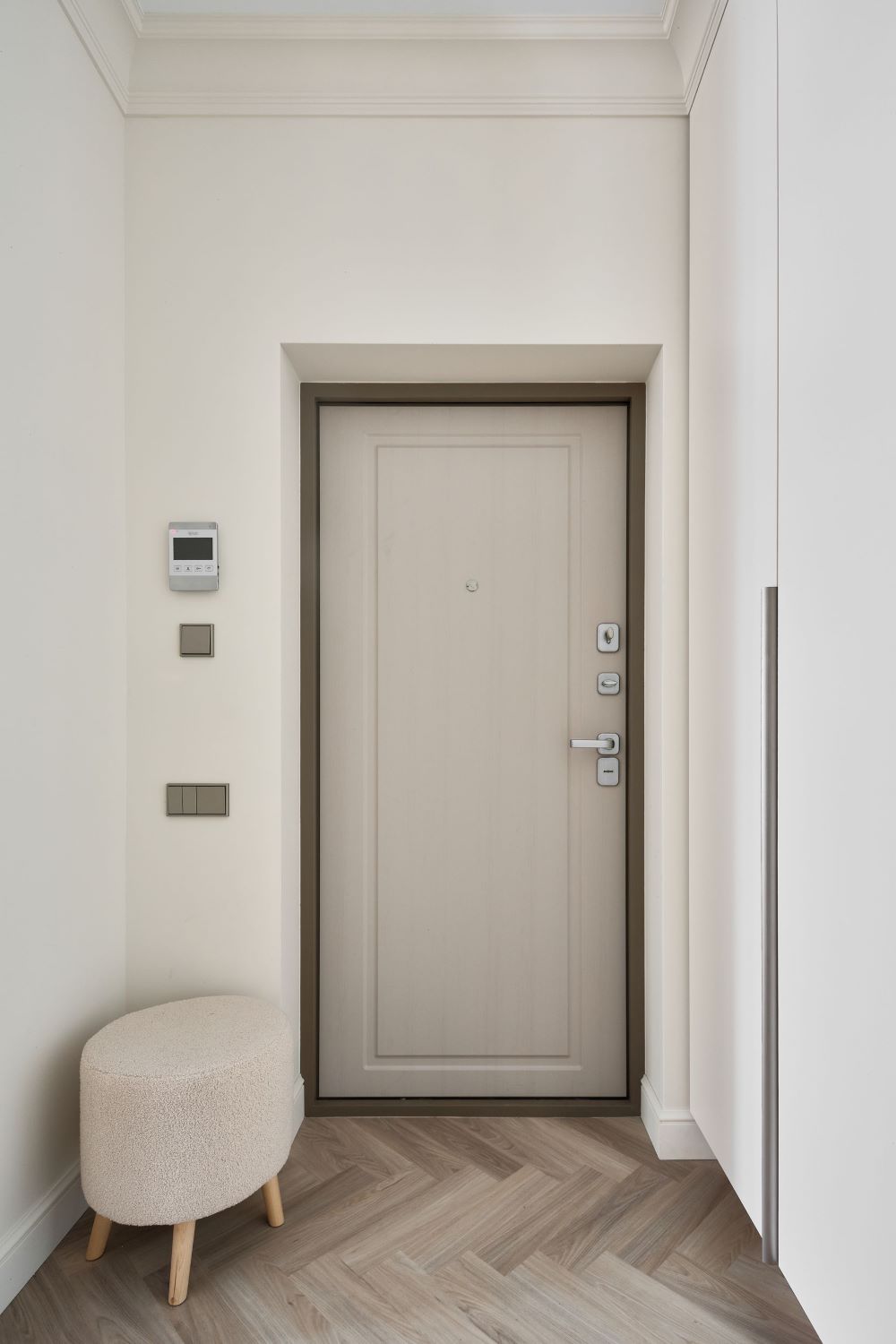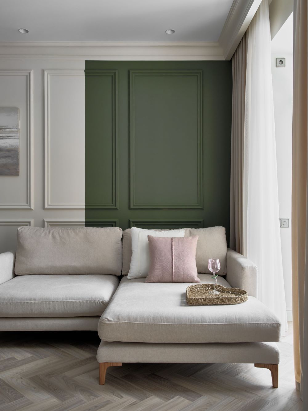 Классика этого интерьера читается в деталях — филёнках на стенах, широких карнизах и спокойной симметрии. Пространство звучит современно и легко, как продуманная композиция без лишних нот. Акцентная стена в цвете хаки добавляет интерьеру глубину и гармонично объединяется с тёплым деревом в отделке.